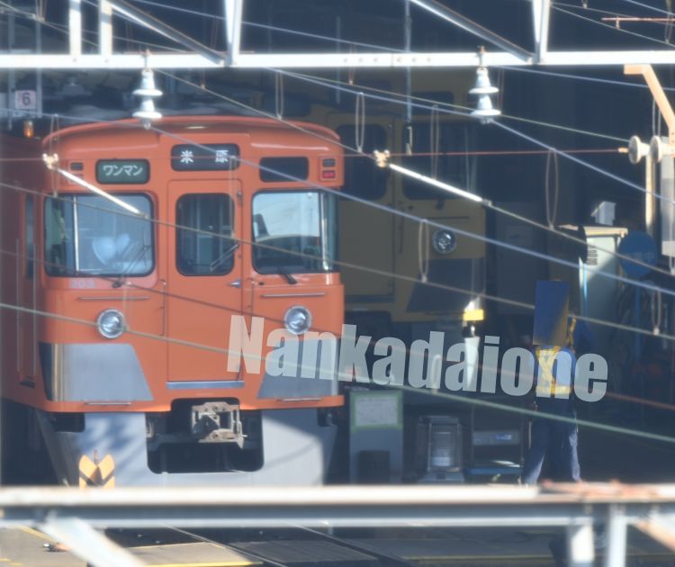 本日2026年2月4日これまでにおいて彦根の車両基地において昨年秋に甲種輸送でやってきてこれまでにオレンジ色の塗装を纏い助手席窓したに車番を刻まれた近江鉄道の元西武旧2000系2417F改め203Fですが本日2026年2月4日これまでに米原幕を掲出している様子を確認しました